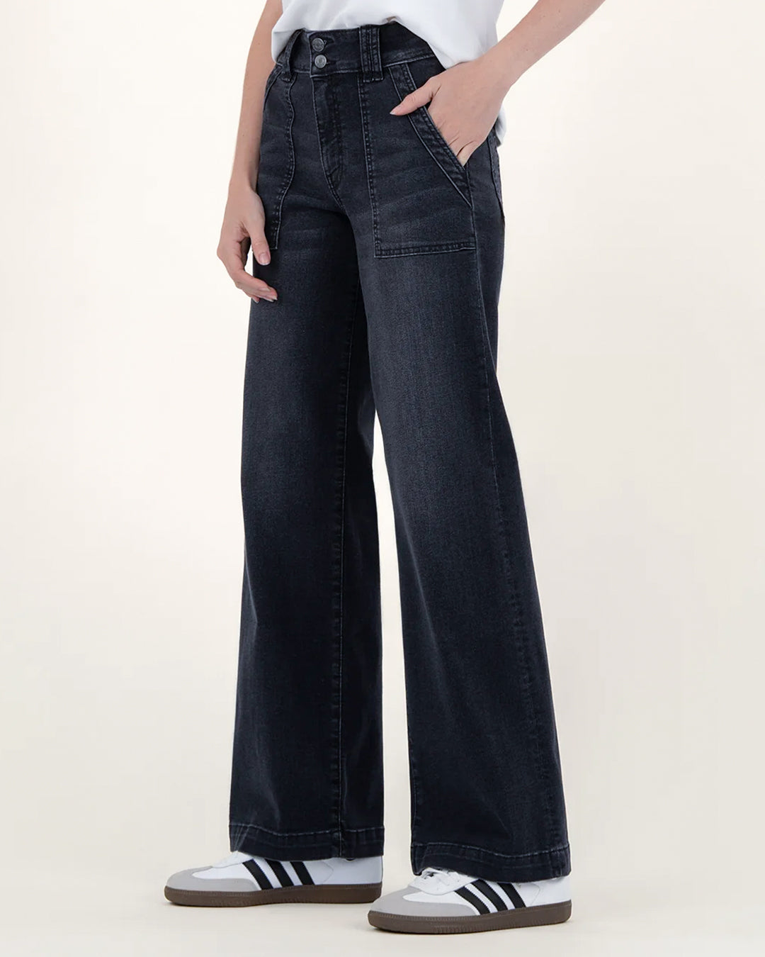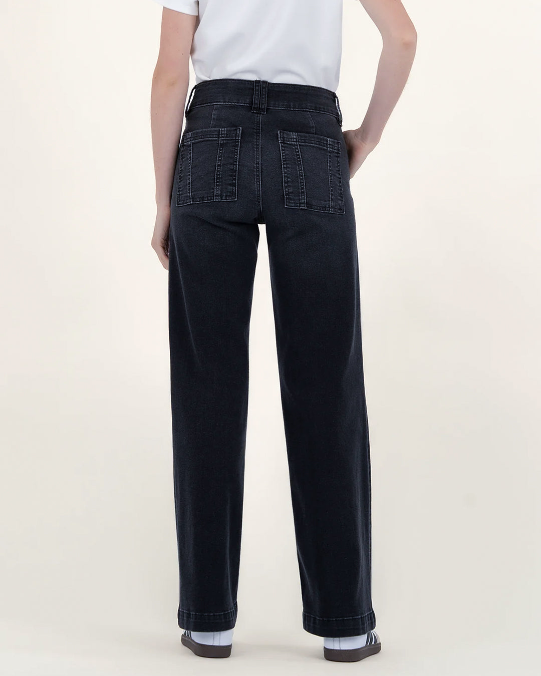 High-rise straight leg jeans in a sleek black wash. Featuring unique porkchop pockets, double belt loops, and stylish double front buttons, they’re crafted from very stretchy fabric for a flattering fit that moves with you all day long.