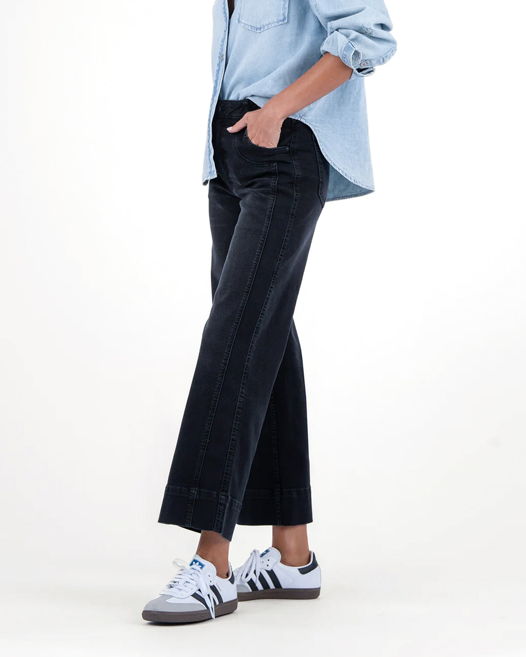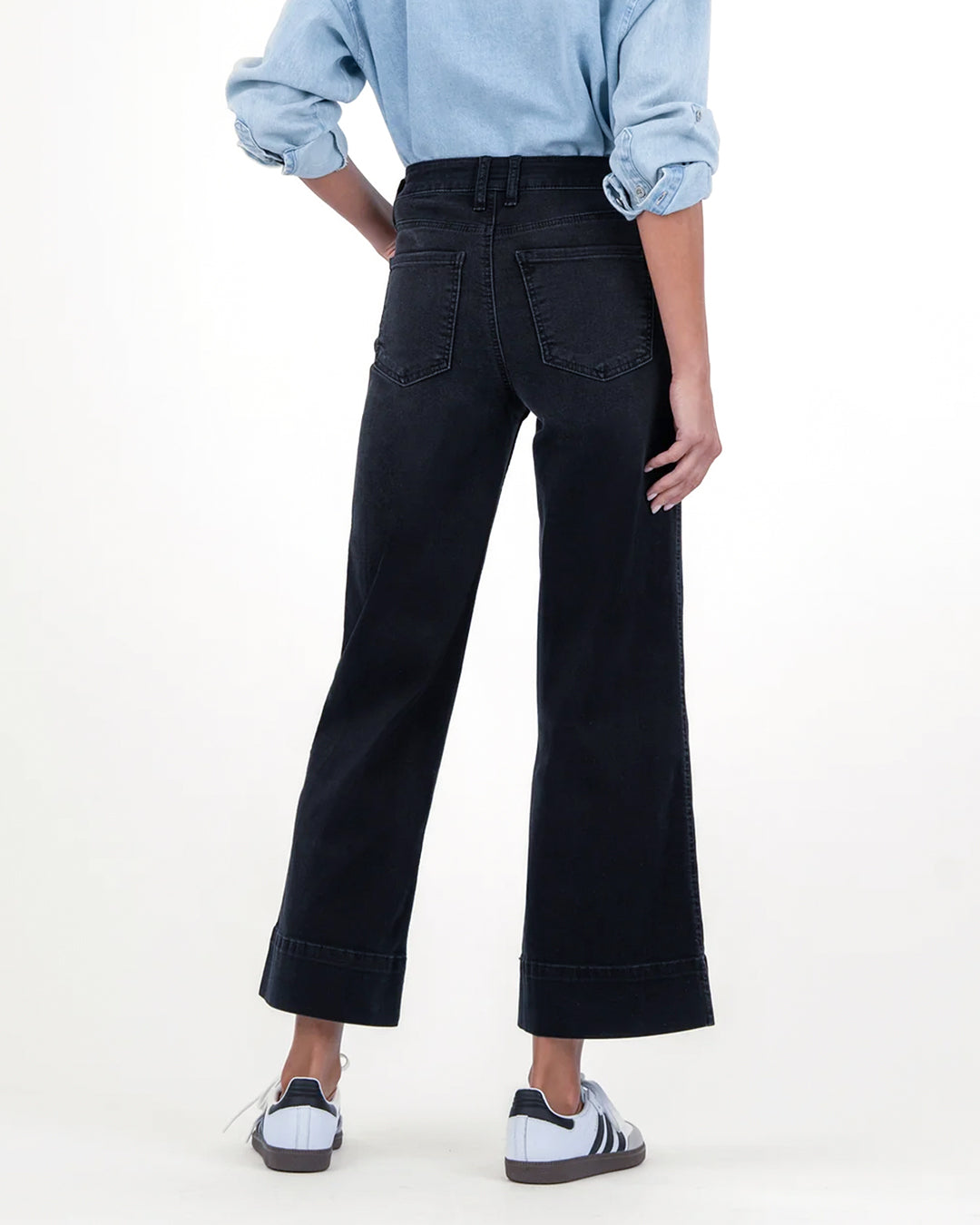 Designed to flatter, these high-rise wide leg jeans come in a sleek black wash and are made from a soft, stretchy material for ultimate comfort. Featuring Fab Ab pockets, double front pockets, and a wide hem, they offer a modern silhouette with just the right amount of structure and style.
