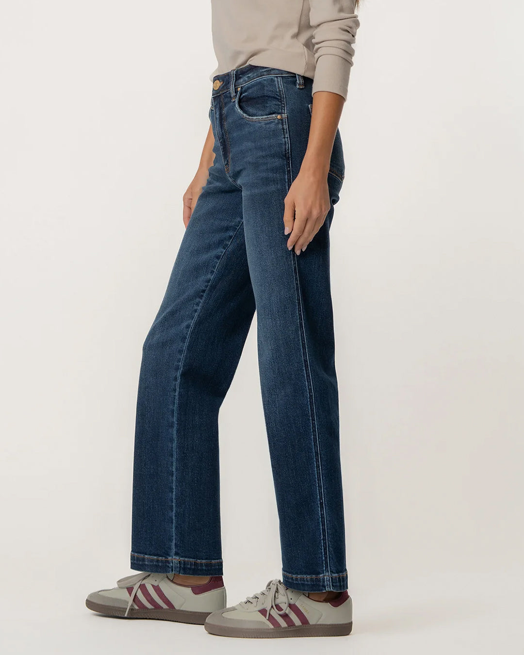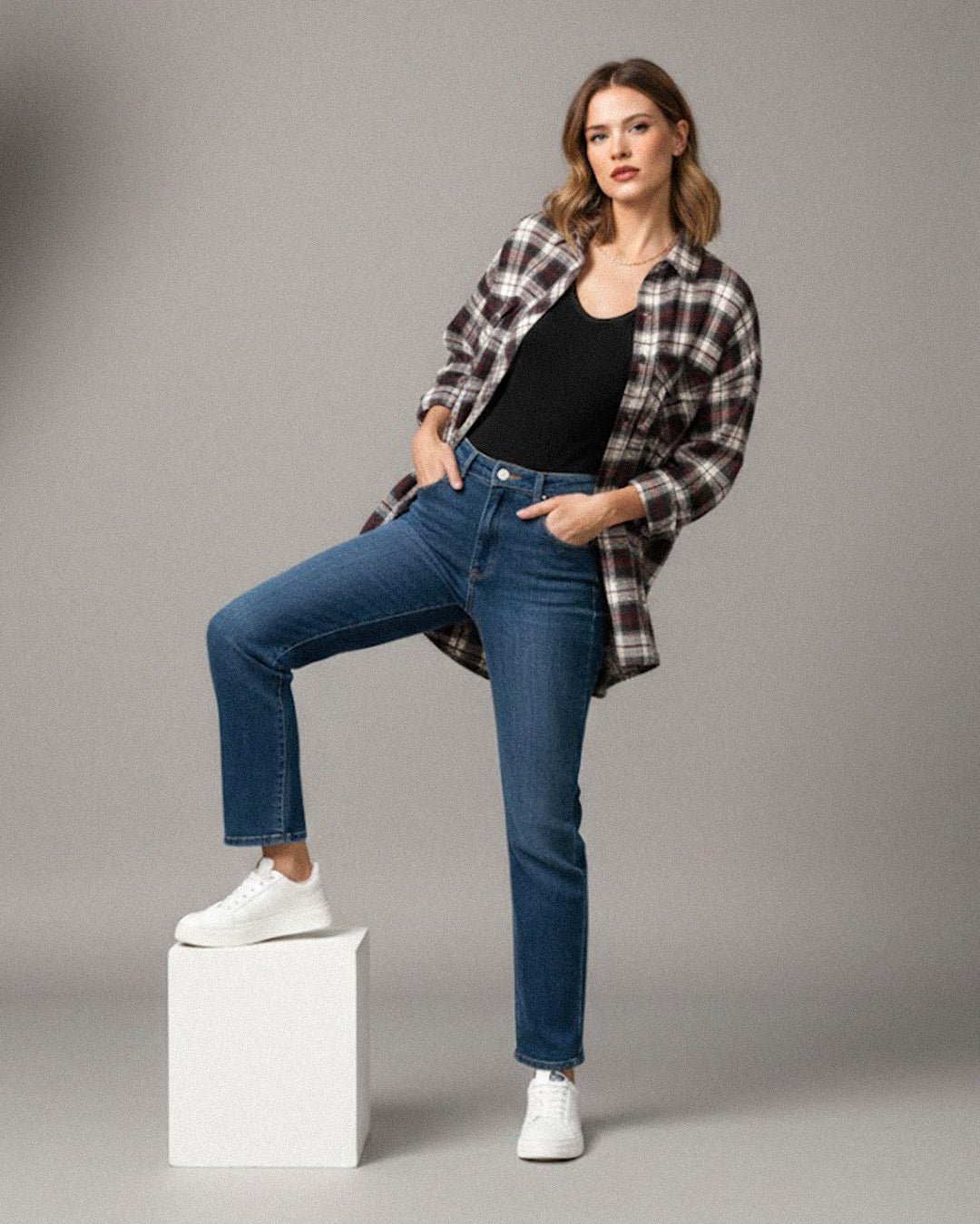 These high-rise straight leg jeans offer a flattering fit with a classic 5-pocket design and a rich dark wash finish. Made from very stretchy material, they provide all-day comfort without losing their shape. A perfect blend of style and ease, they’re your new go-to for any occasion.