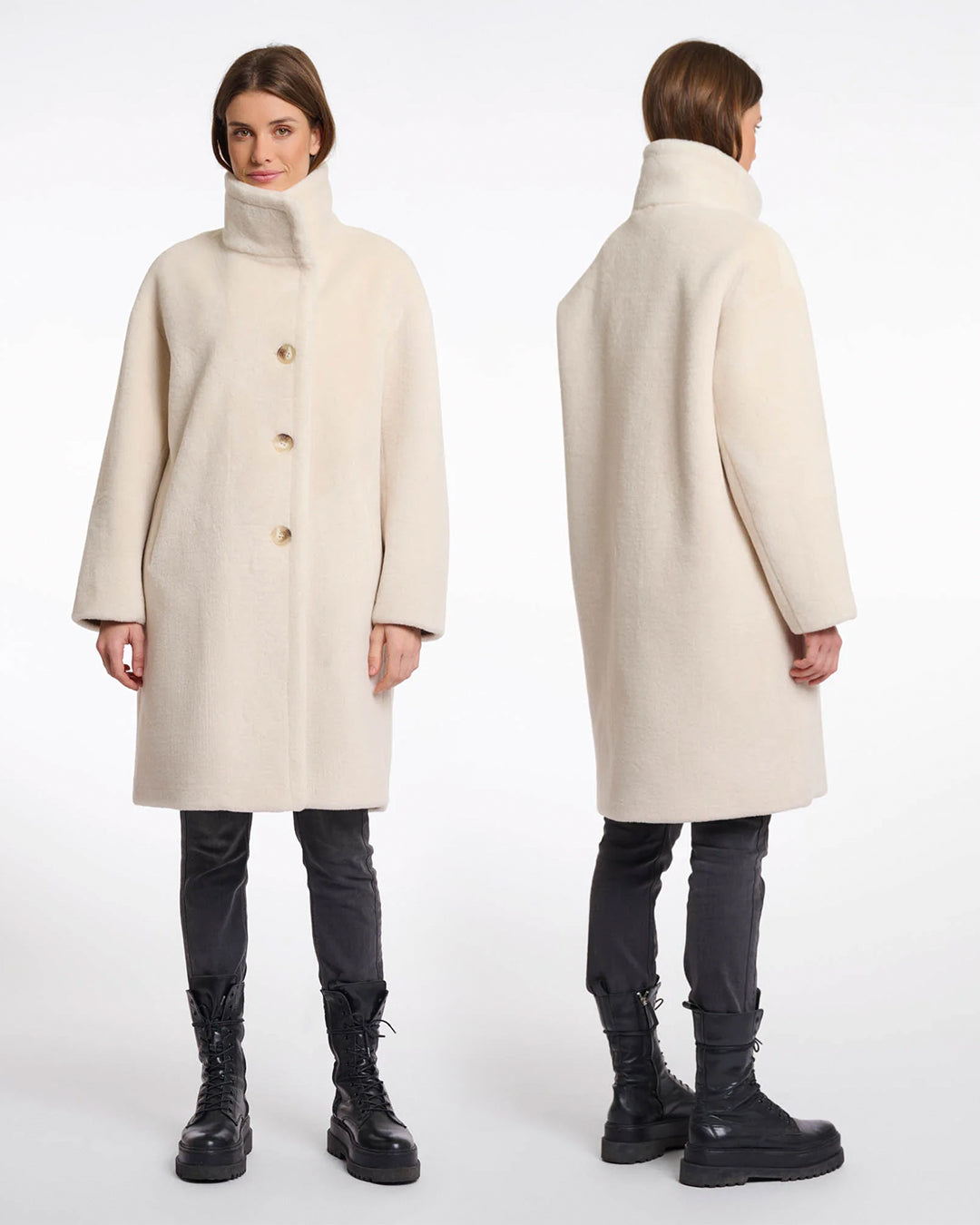 This medium-length cut with a high neck collar, button up fastening and two hidden pockets on the sides. It's the perfect piece to snuggle up in and feel warm and stylish. You won't want to take this coat off.