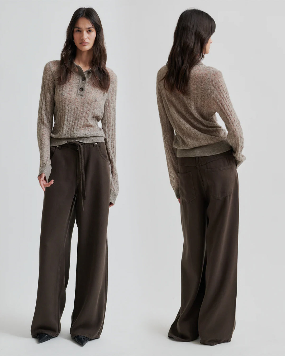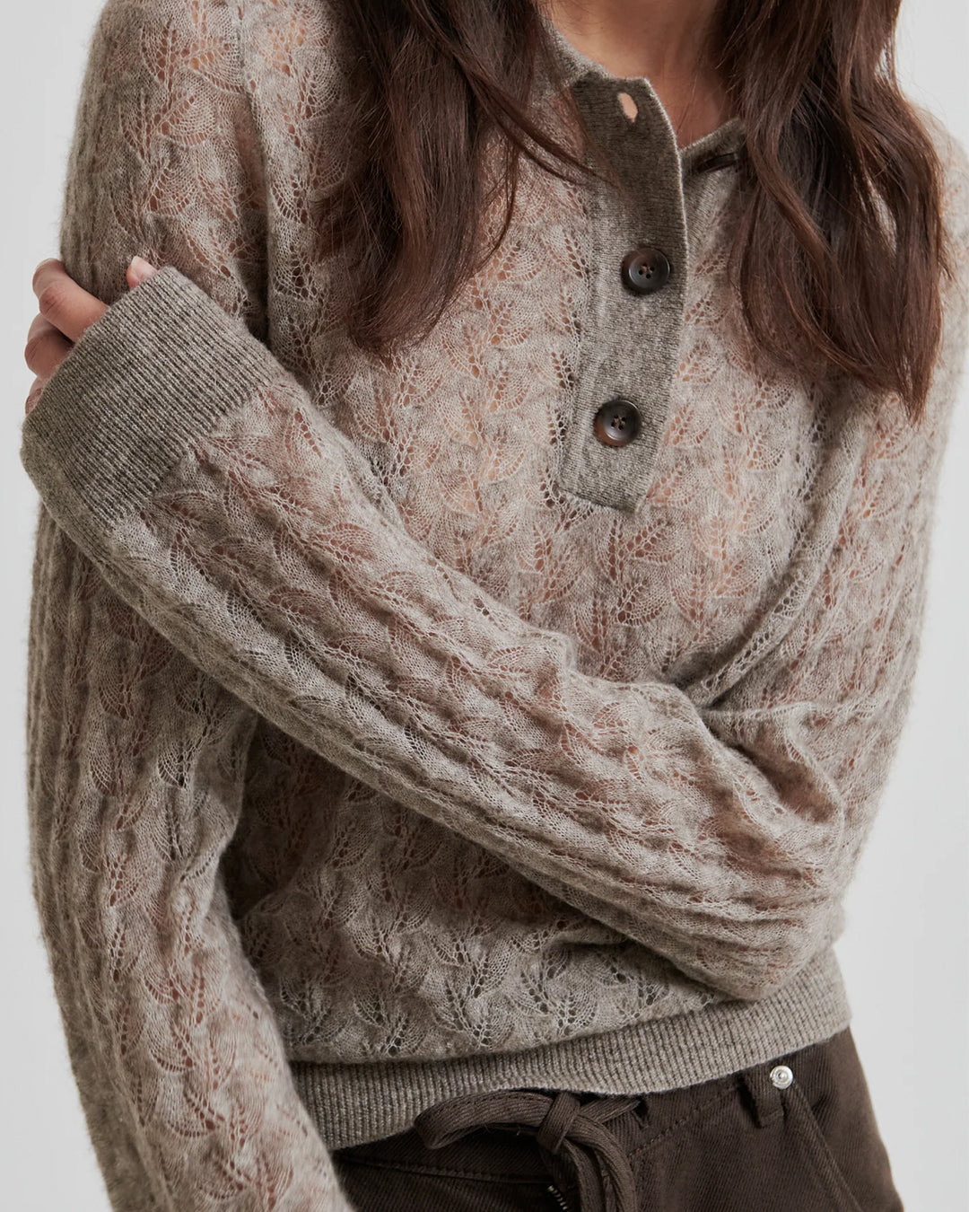 Second Female pullover with collar. The pullover is made in an ultra-soft yak blend with delicate, semi-sheer knit. Featuring a ribbed collar and half placket with button fastening at the front. Dropped shoulders with long sleeves. Ribbed cuffs and bottom hem. Slim fit.