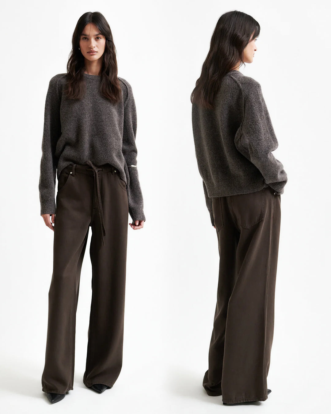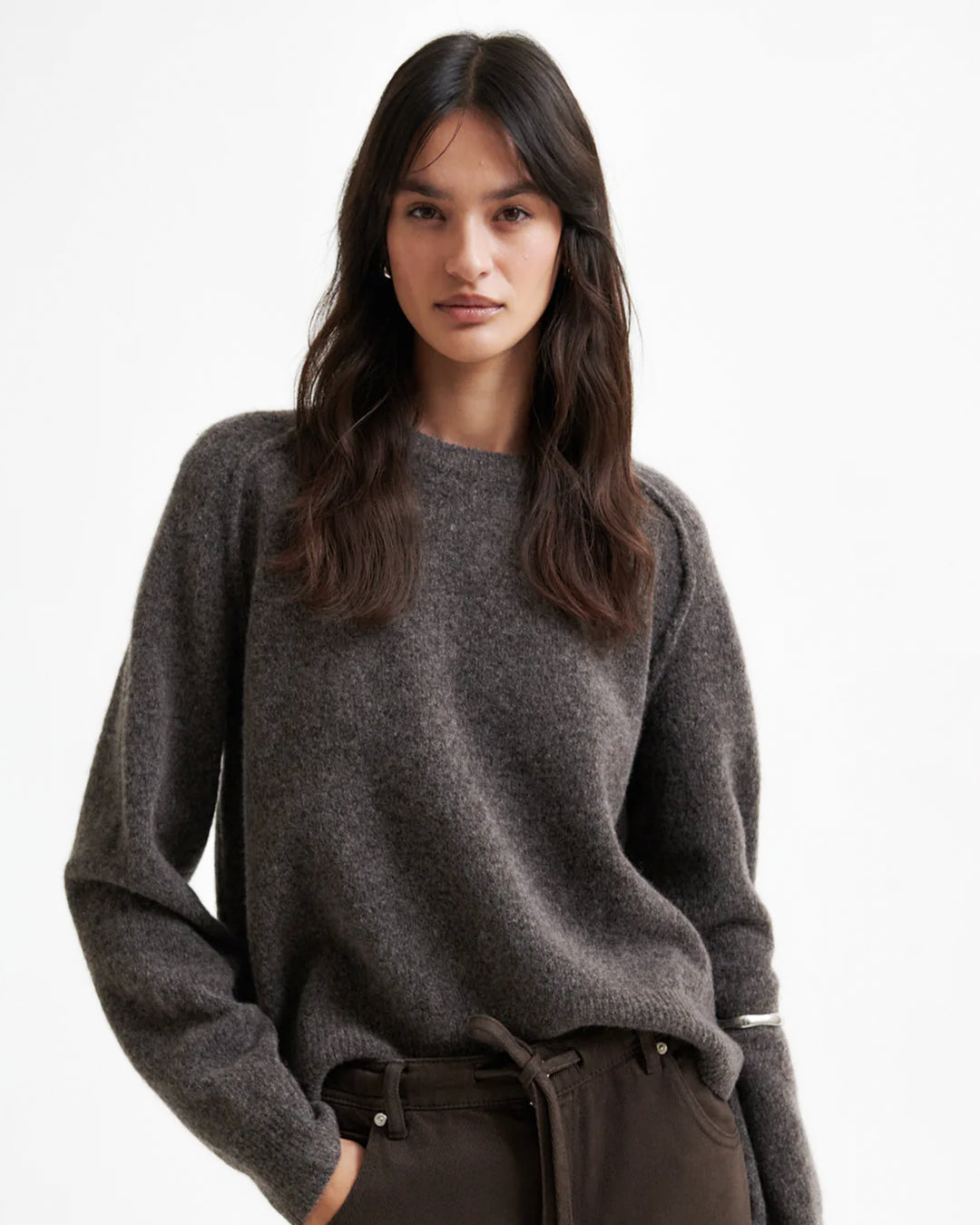 The pullover is made in a soft wool blend. Featuring a round neck and raglan sleeves with reverse shoulder seam details. Ribbed neck, cuffs and bottom hem. Regular, slightly wider fit.