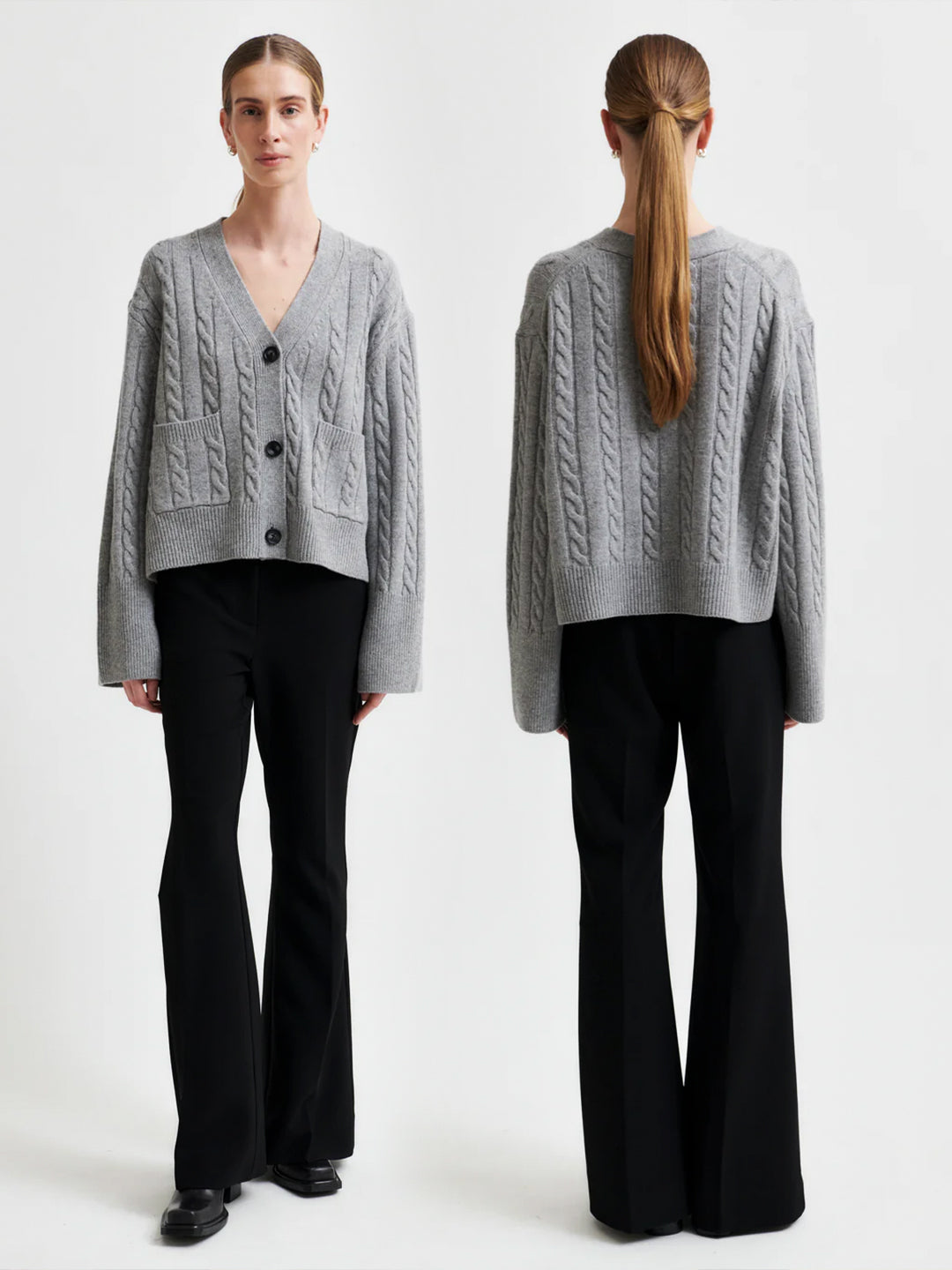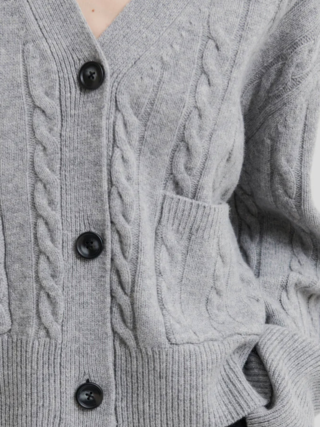 The cardigan is made in soft and stretchy wool with cable knit pattern. Featuring a V-neck, button-through fastening and two patch pockets. Dropped shoulders and long sleeves with wide cuffs. Ribbed trim at neck, placket, cuffs and bottom hem. Slits at sides of bottom hen. Wide and loose fit.