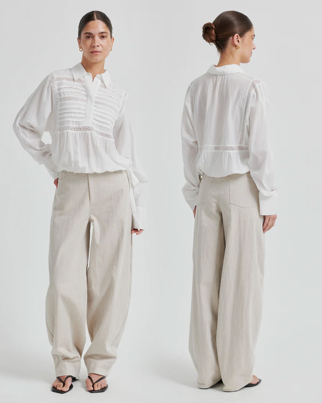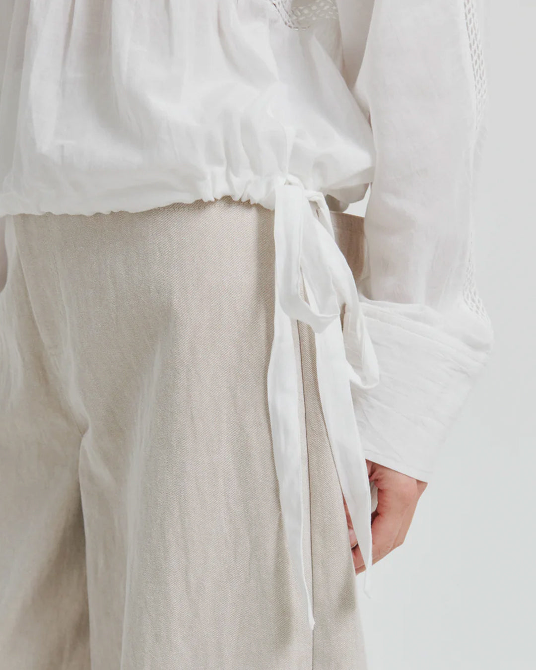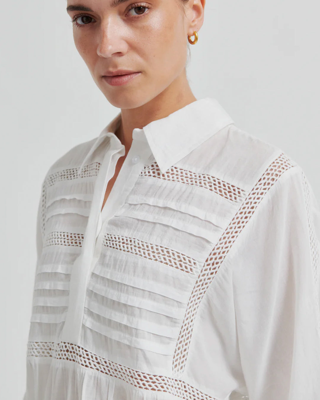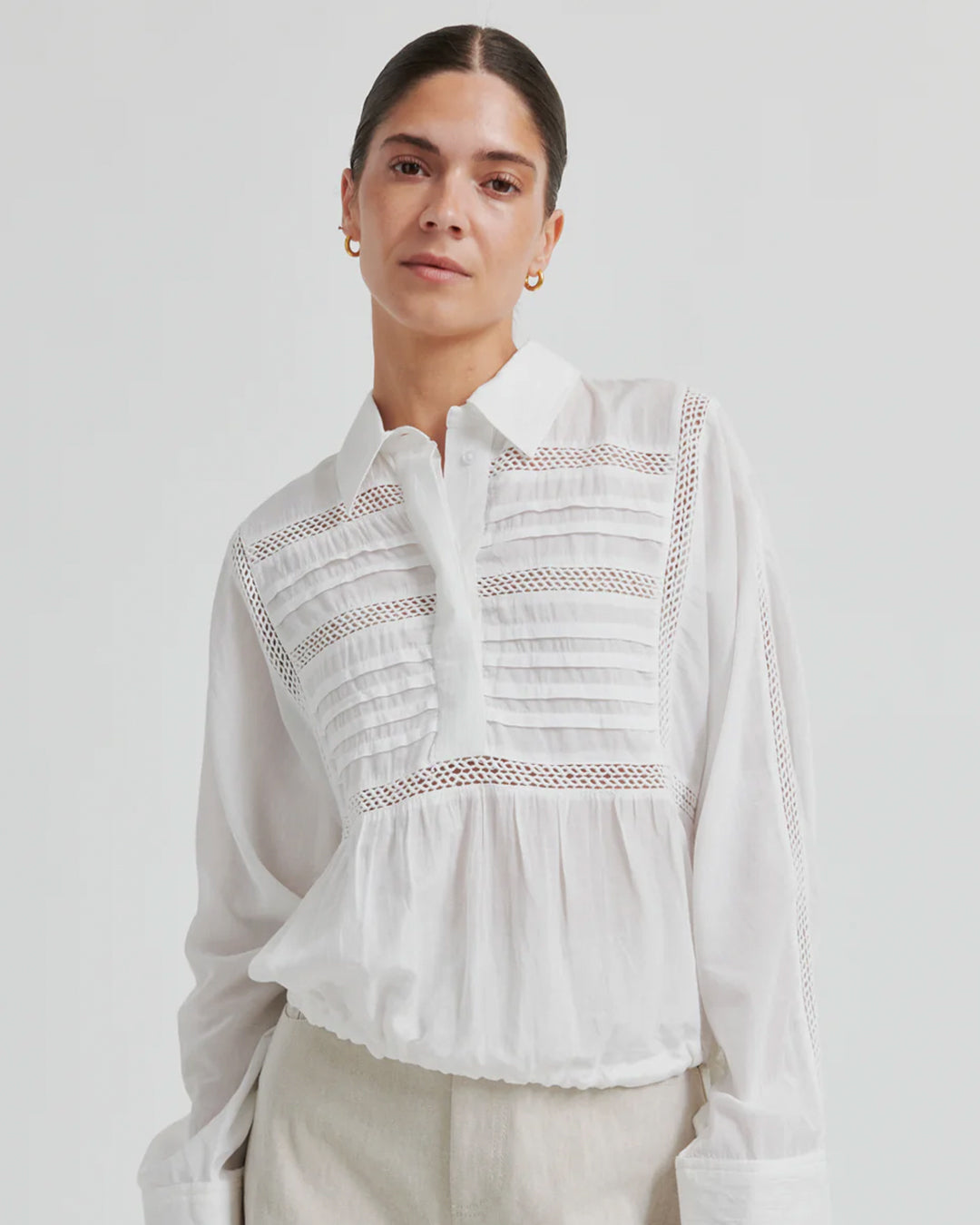 Second Female blouse with ladder lace. The shirt is made in smooth, cotton blend with ladder lace details. Featuring a collar with half placket and concealed buttons. Buttoned cuffs and drawstring at bottom hem. Loose fit that can be adjusted.