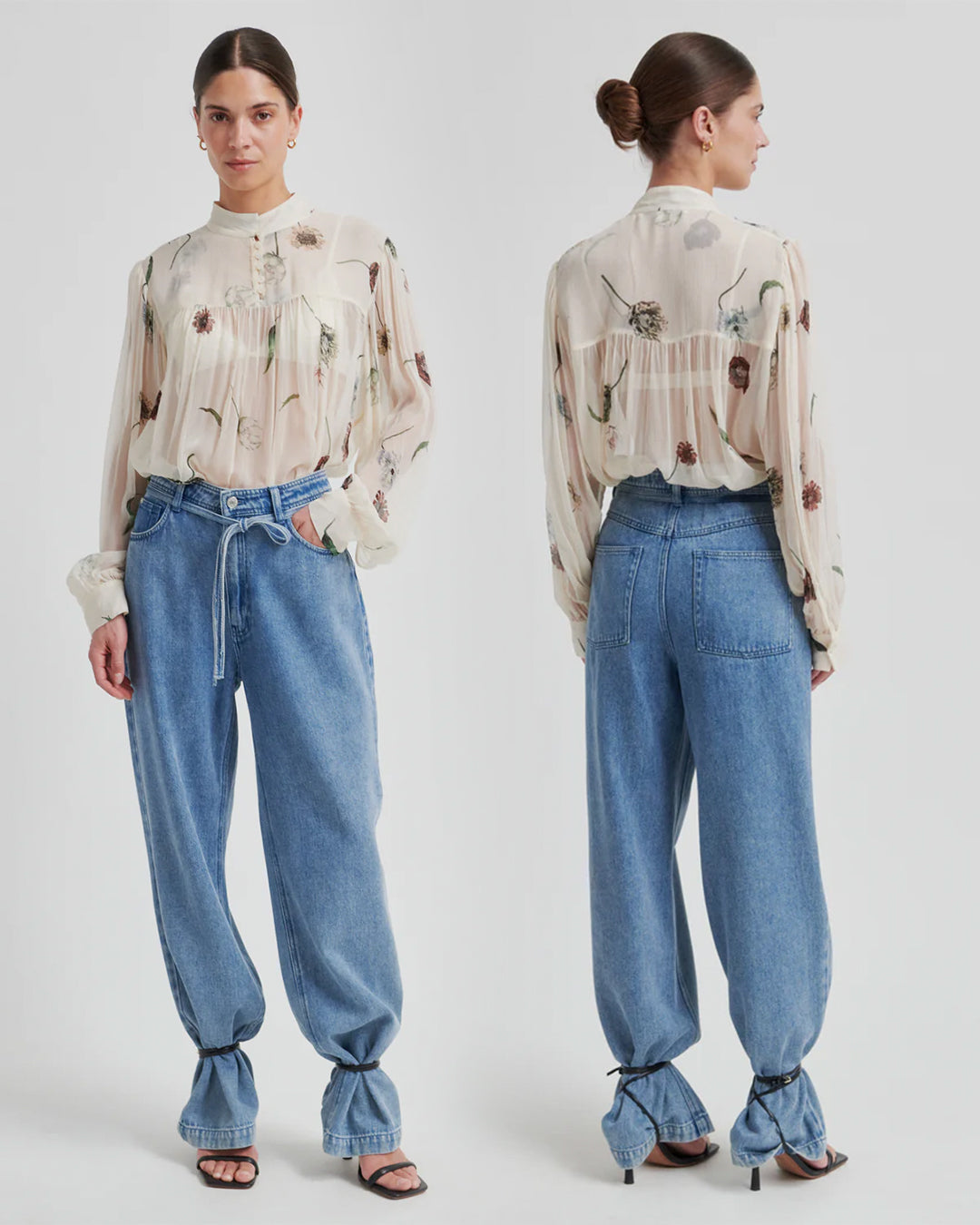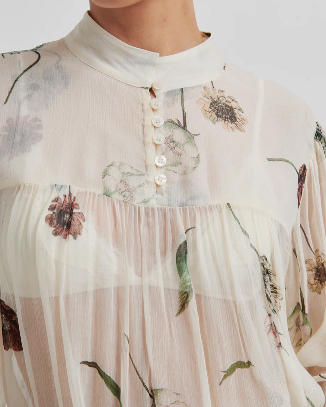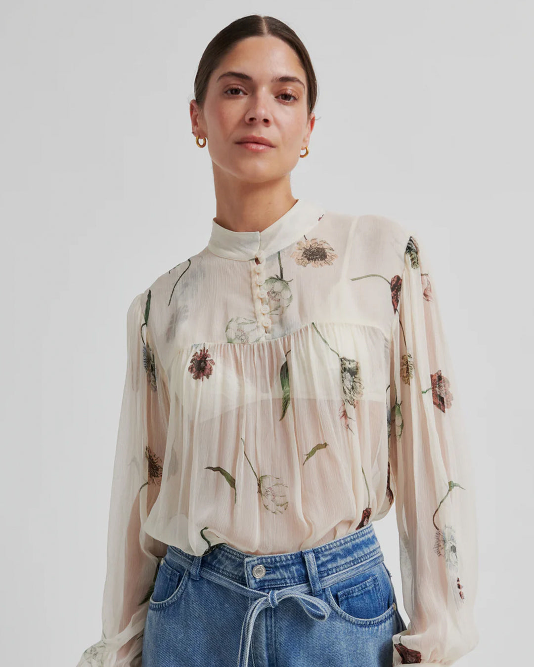 Second Female floral blouse. The shirt is made in sheer chiffon with floral print. Featuring a high round neck with button fastening at the front. Gathered yoke and long puffed sleeves with buttoned cuffs. Scalloped bottom hem. Loose and airy fit.