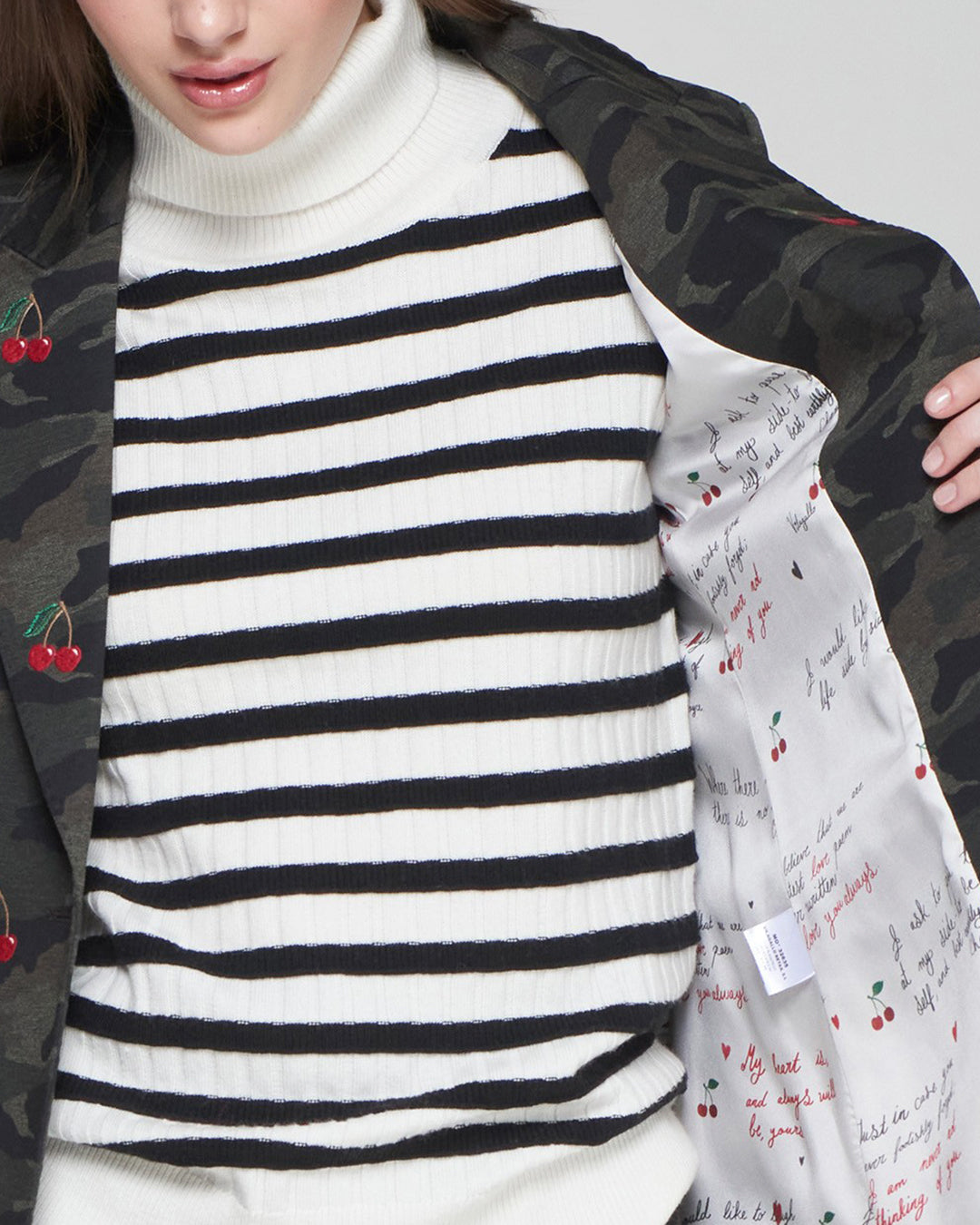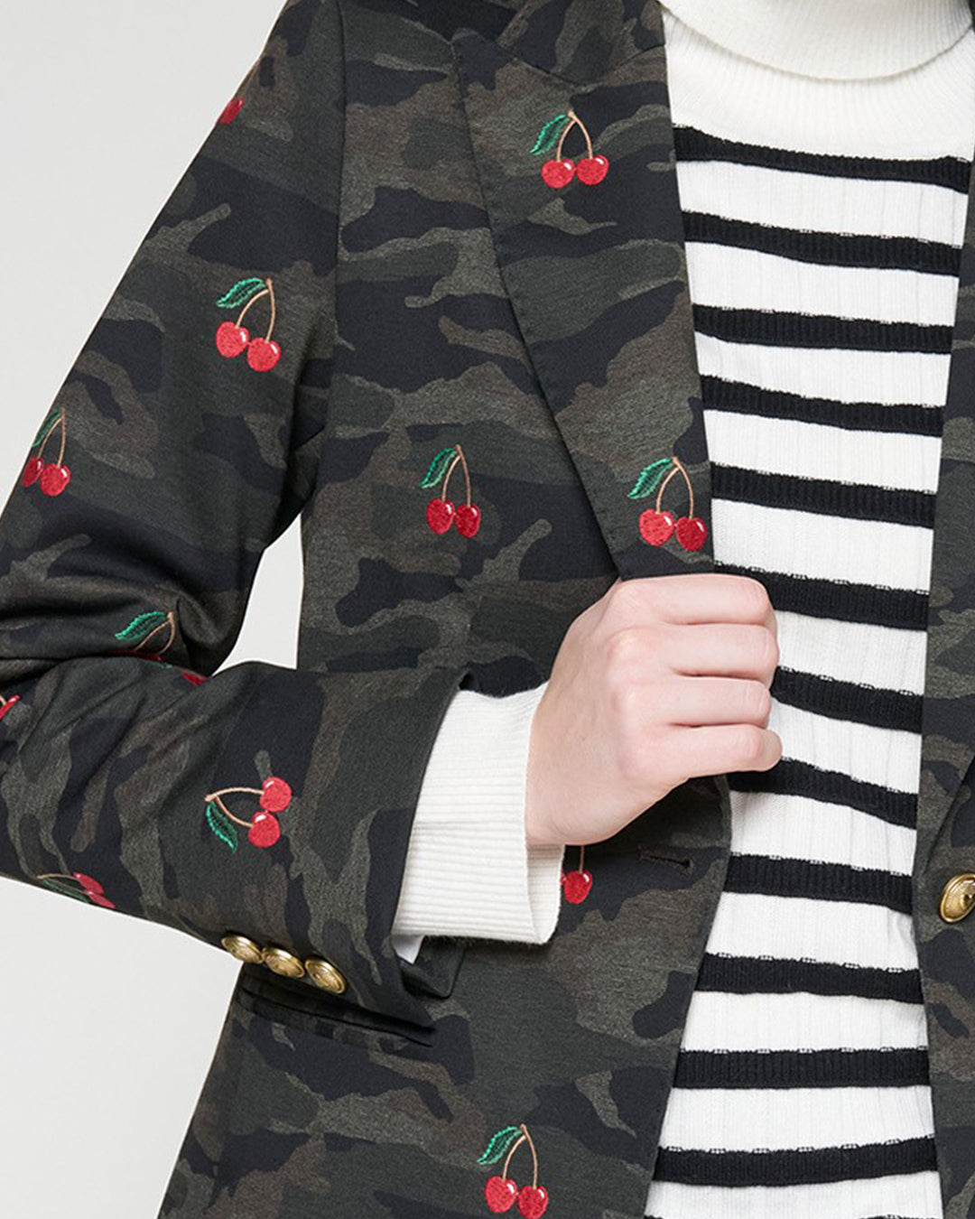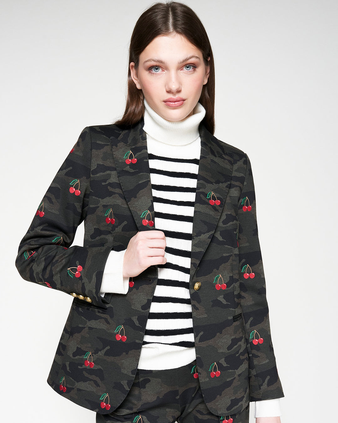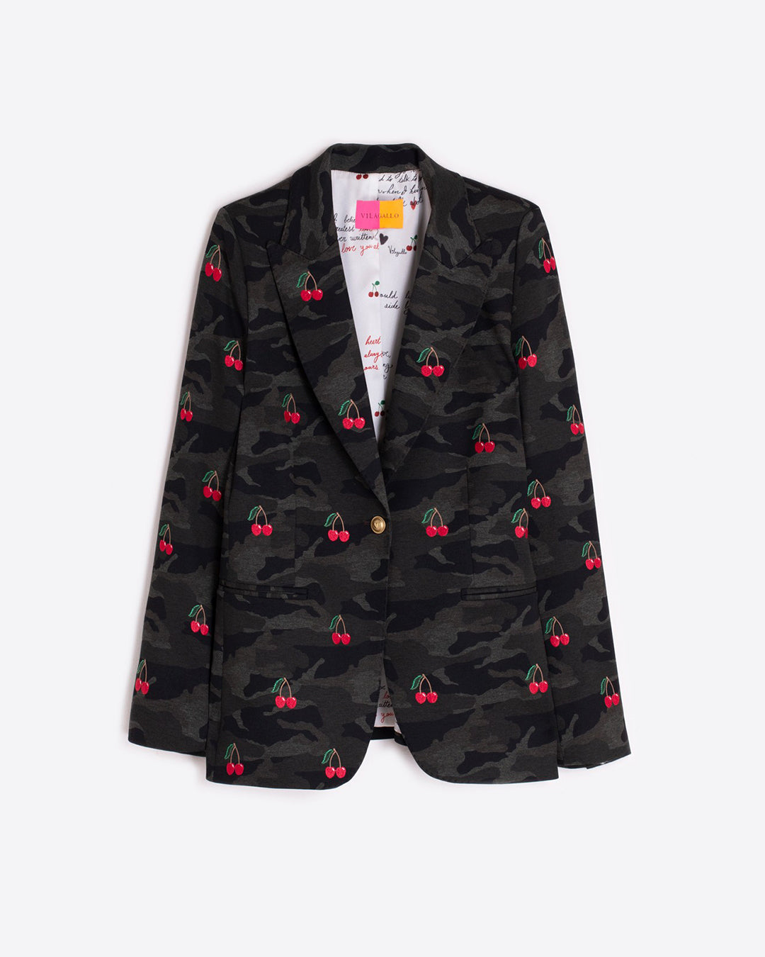 Knit blazer with a dark camouflage and red cherry embroidery. Tailored silhouette with classic lapel, gold decorative front button and straight hem. Sleeve cuffs finished with a row of gold buttons.