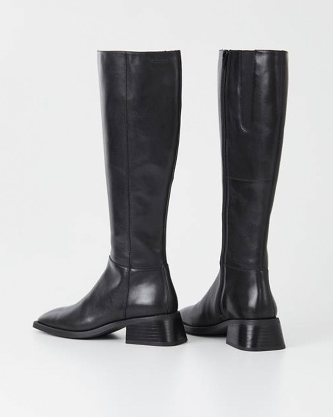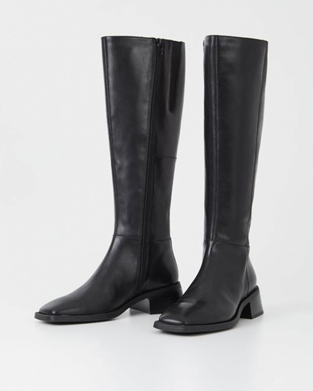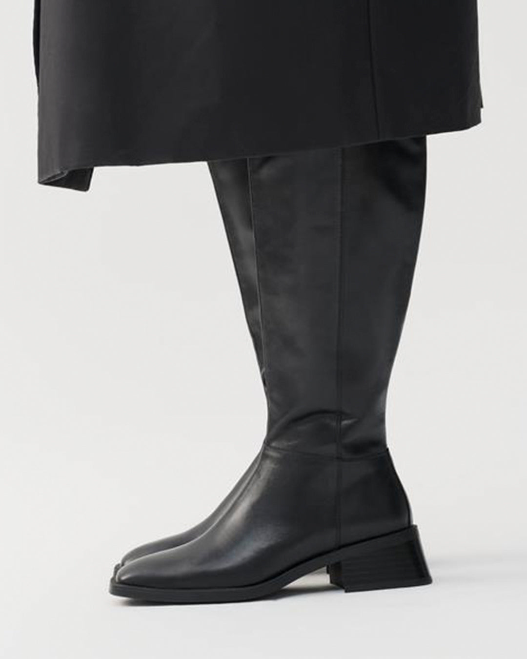 Blanca is the contemporary tall boots with a timeless design. The style is crafted in black leather featuring a knee-high shaft, subtle square toes and inside zippers. The thin rubber outsoles is complemented with 47mm flared block heels.
