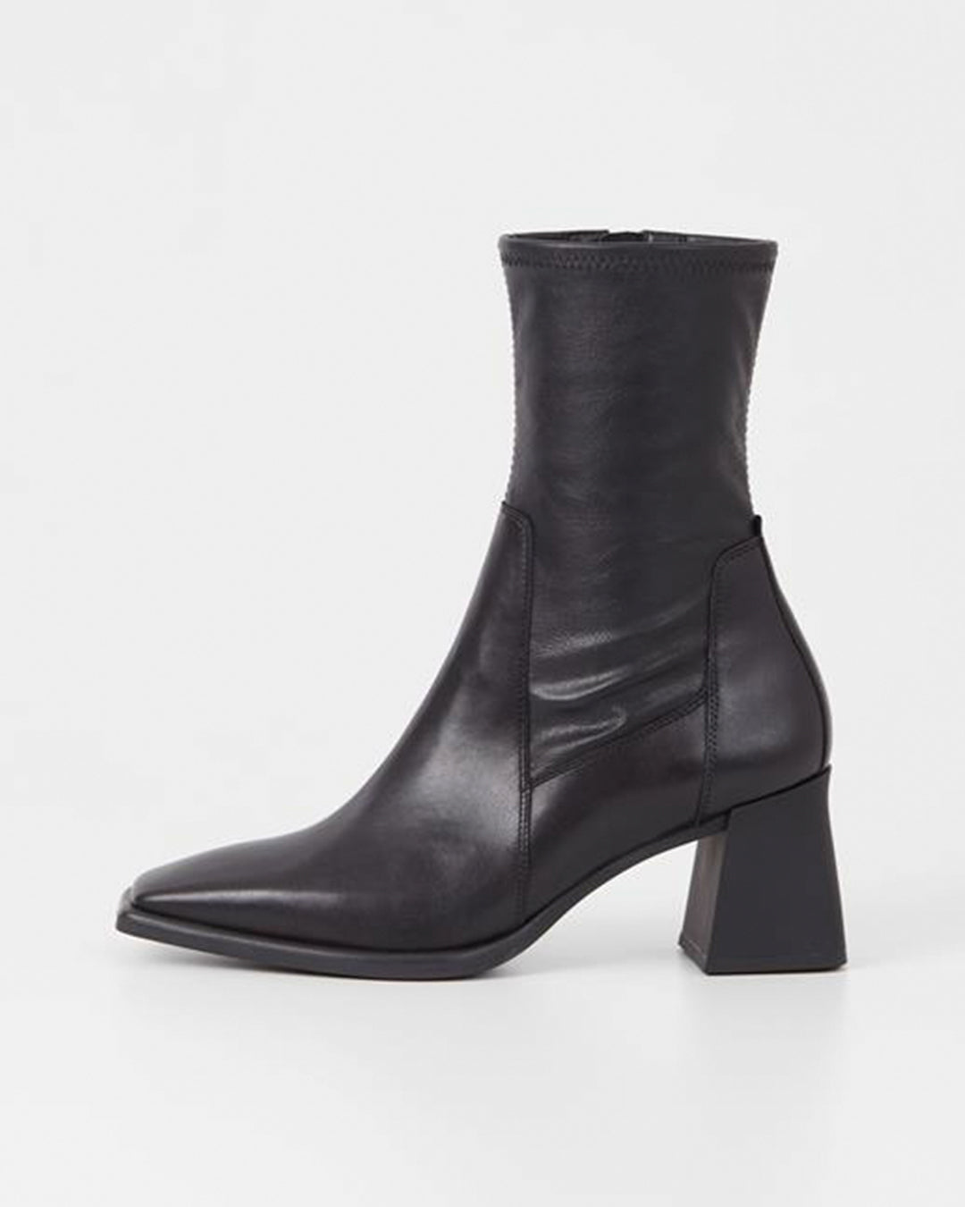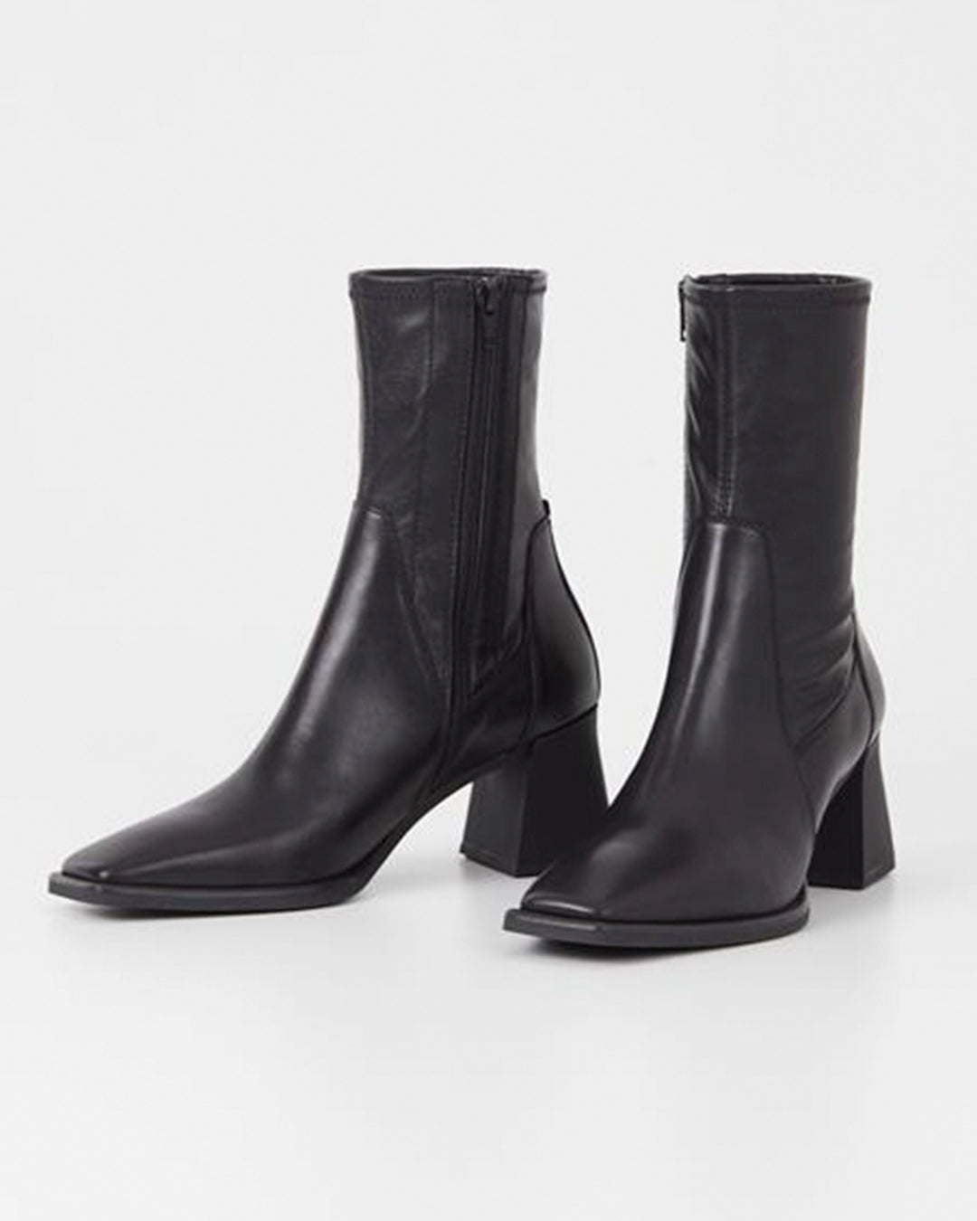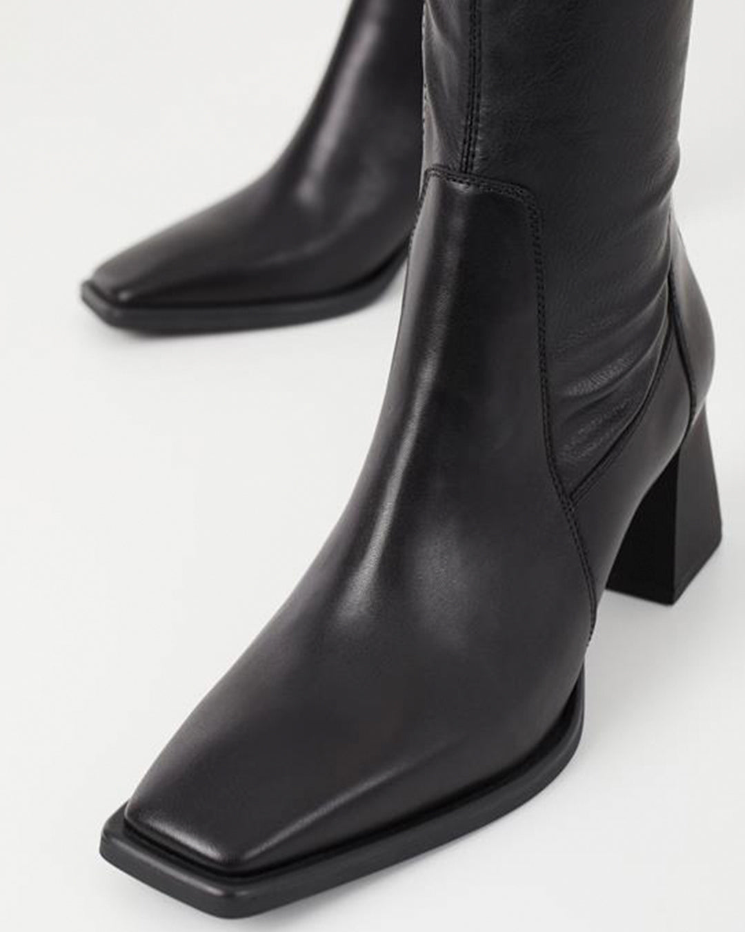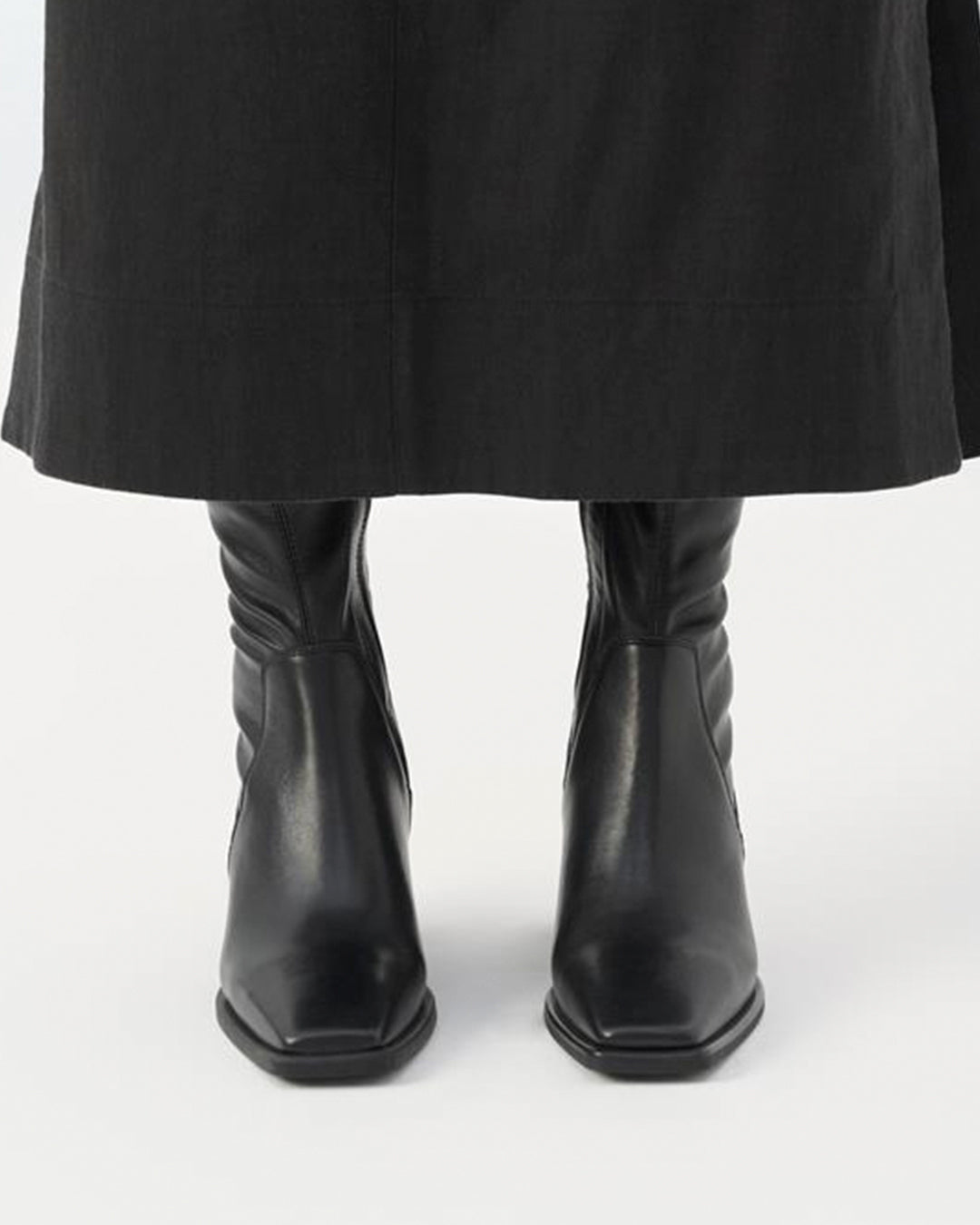 Hedda is an everyday stretch boot crafted from black leather and synthetic leather. It has a stretchy shaft, square toe shape, and zip-side fastening. The flared block heel measures 70 mm.